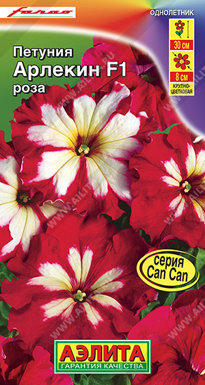 Неповторимая крупноцветковая петуния от итальянской компании Farao из серии «Саn Can».. Обладает отличными декоративными качествами: густой куст высотой 25-30 см, пышное цветение, устойчивость к болезням. Пленительные звезды слегка бахромчатых цветков диаметром 7-8 см будут сиять в вашем саду на протяжении всего лета. В зависимости от условий выращивания соотношение белого и красного оттенков на венчиках может значительно меняться, в этом состоит уникальность гибридов Арлекин. Серия украсит бордюры вдоль дорожек, цветники и балконные контейнеры.